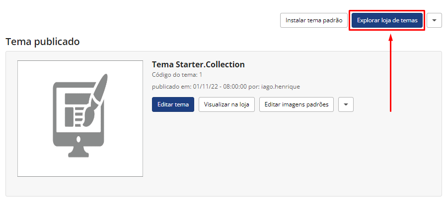 Para realizar esse teste, basta ir em: Minha loja > Design da Loja > Explorar loja de temas