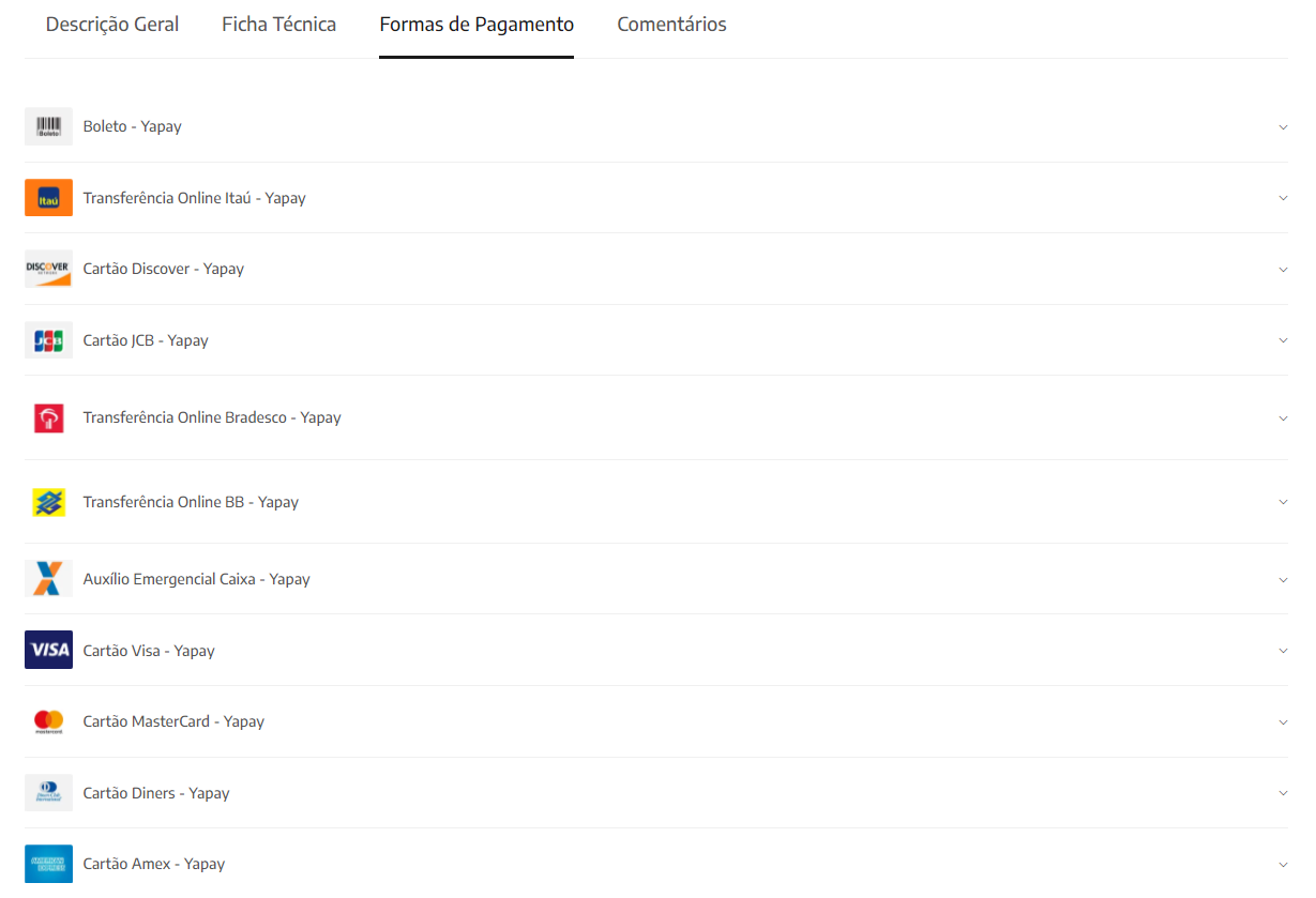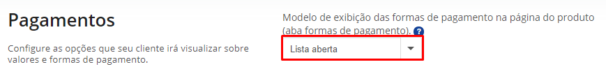 As formas de pagamento na página do produto (como mostra a imagem acima), só serão exibidas se a configuração de visualização das formas de pagamento estiver selecionada como Lista aberta. Para realizar essa configuração, na plataforma da Tray, vá até o menu de Configurações > Configurações Gerais > Pagamentos. Essa configuração precisa estar selecionada como Lista aberta para ser exibida corretamente em sua loja, como mostra a imagem abaixo: