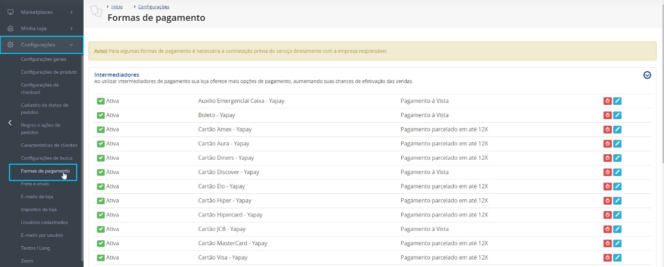 Outra parte importante de todas as lojas são as Formas de Pagamento. Cartão de Crédito, Débito em conta e boleto bancário são as mais utilizadas hoje em dia por dezenas de lojas. Para configurar as formas de pagamento que serão aceitas pela sua loja acesse Configurações > Formas de Pagamento.