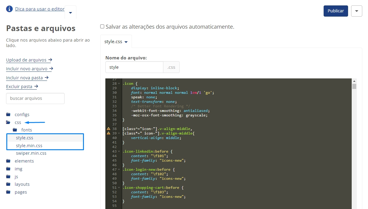 Copie o código minificado gerado pela ferramenta e colo no arquivo style.min.css sobrescrevendo todo o conteúdo já existente. Salve as alterações utilizando o botão salvar.