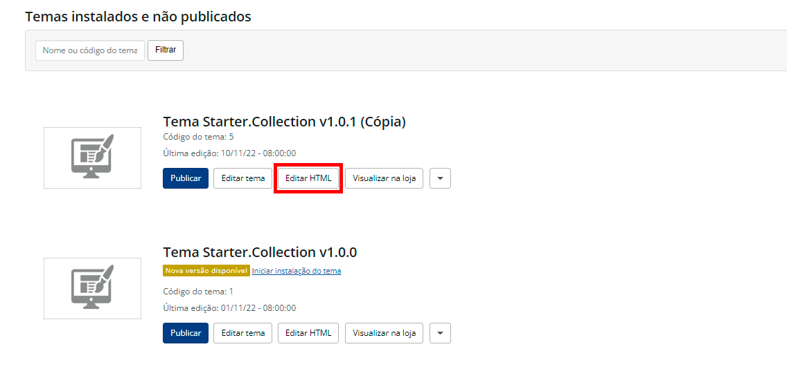 Após duplicar o tema você terá acesso a uma nova opção chamada Editar HTML. Será através dela que você terá acesso ao editor online da plataforma para fazer as edições.