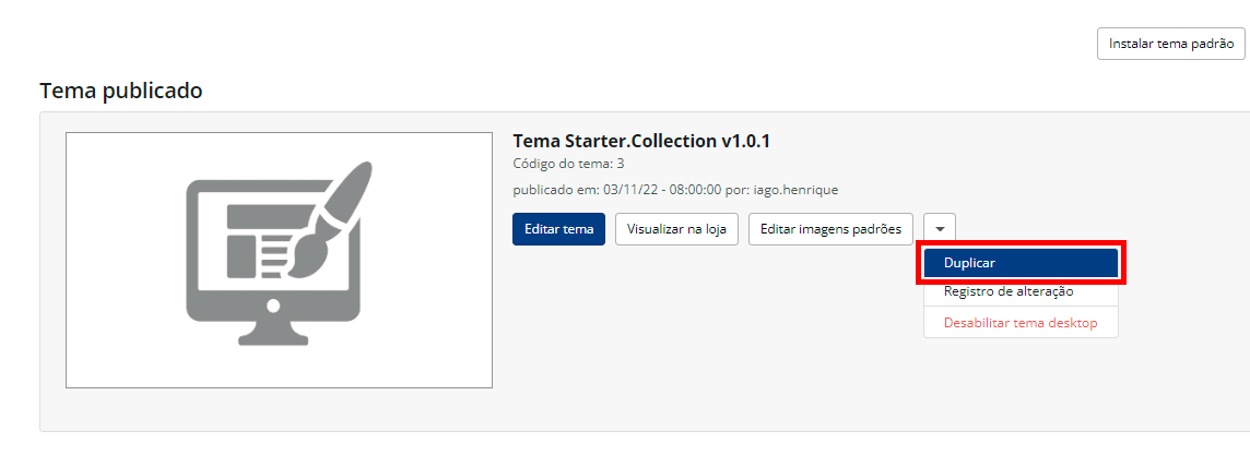 Para fazer qualquer modificação mais complexa no seu tema, será necessário que ele não esteja publicado. Mas não se preocupe, você não precisa tirar a loja do ar, basta duplicá-lo. Caso o seu tema não esteja publicado ainda, você poderá fazer as alterações sem a necessidade de duplicá-lo, apesar de recomendarmos duplicar.