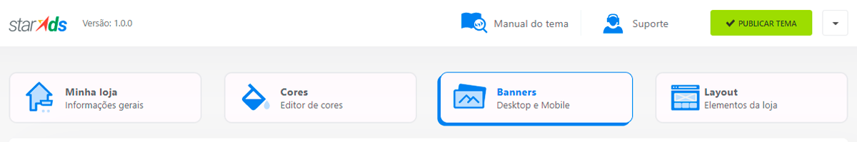 A aba Banners permite fazer a configuração de exibição do banner principal, o Banner Home.