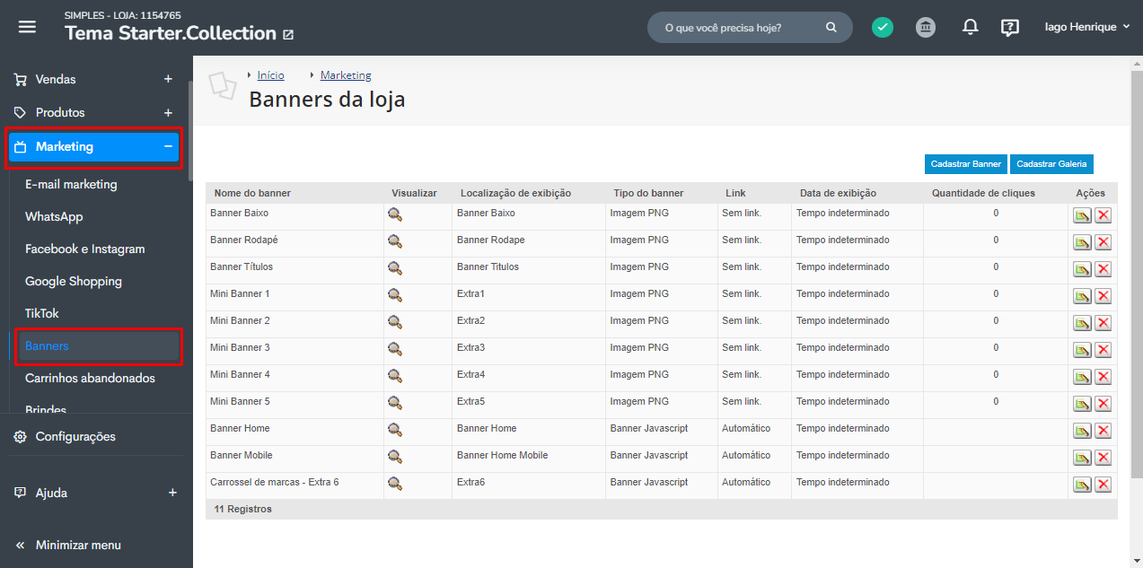 Os banners podem ser cadastrados no painel administrativo acessando Marketing > Banners.